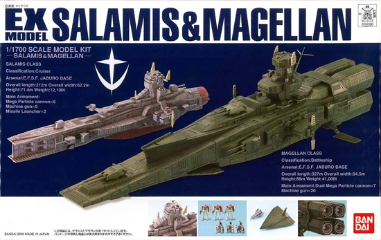This sweet set contains parts for two ships — the Salamis and the Magellan. As usual with Bandai’s EX models, the detail on both is simply amazing, and well worth the price! As a bonus, three scale GM’s and three scale Balls are included — as are detachable shuttles and display stands for each of the ships. Please note that the EX line of models, while they’re molded in colour, require paint and glue for completion.