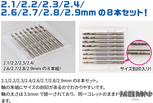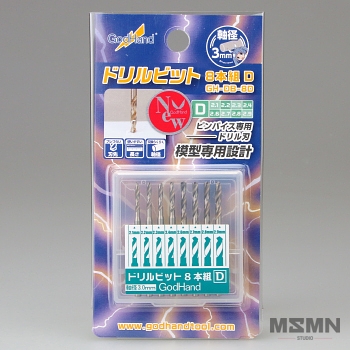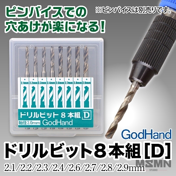 “GodHand expands their superior tool-building knowledge into the world of drills with this set of 8 drill bits! With a shortened overall length compared to other drill bits, these have been specifically designed with model-building in mind. They’re designed for use with a pin vise that can grip items with an axis of 2.5 to 3.2mm.