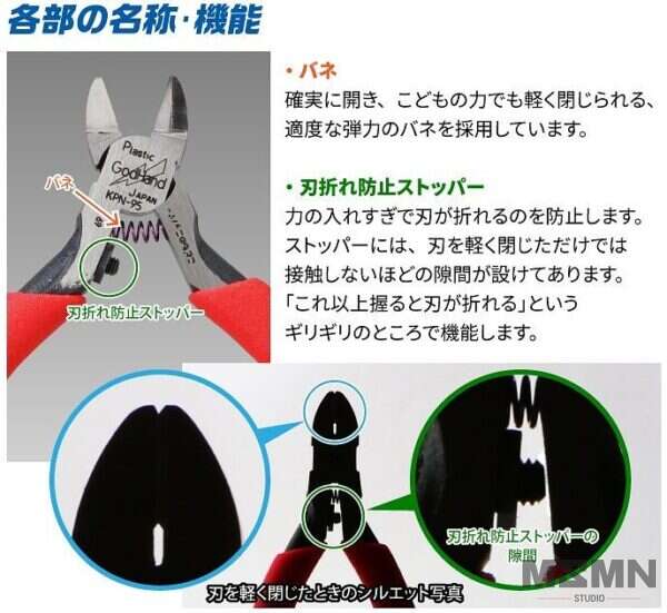 This smaller-than-usual set of nippers by GodHand was developed with kids in mind! Its small size and shape is easy for youngsters to handle, with beveled tips to prevent sharpness at the ends. The blades are single-edge, with a soft grip, and can be used to cut plastic marked PS, PP, ABS or PE. Can cut materials up to 3mm thick, but since PS plastics can be hard, please only use these nippers on PS plastic of 2mm or less thick. Includes a tip guard, too.