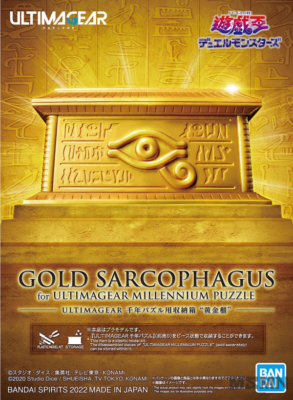 The Gold Sarcophagus from “Yu-Gi-Oh! Duel Monsters” gets a new Ultimagear model kit from Bandai! All 33 pieces of the Ultimagear Millennium Puzzle (sold separately) can be stored inside; the chest’s exterior is precisely molded to exactly resemble the one seen in the anime. Order yours today!