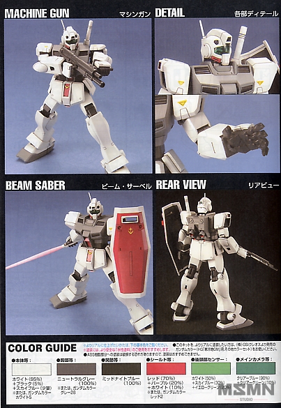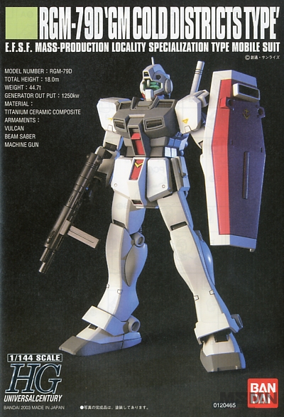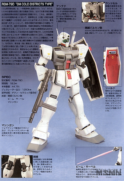 Lovely high-grade kit of the RGM-79D GM, modified for use in the ‘Cold Districts’. Extremely simple instructions are pretty much illustrations only so no language barrier can prevent you from building your kit! The kit is nicely poseable after completion, due to strategic use of polycaps. All parts snap together. Molded in colored plastic; while paint is unnecessary, it will definitely enhance the look of the finished product.