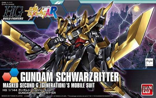The Schwarz Ritter from “Gundam Build Fighters A-R” gets a HGBF kit release from Bandai! The backpack can be transformed into two different weapons: combine the left and right wings and the grip parts mounted on its waist for a single-edged sword, and adjust the left and right wings for an even bigger sword! Dagger blade parts are also included, as are foil stickers for the markings. Molded in goldtone, black, red, gray and white plastic.