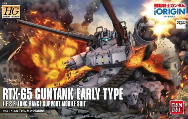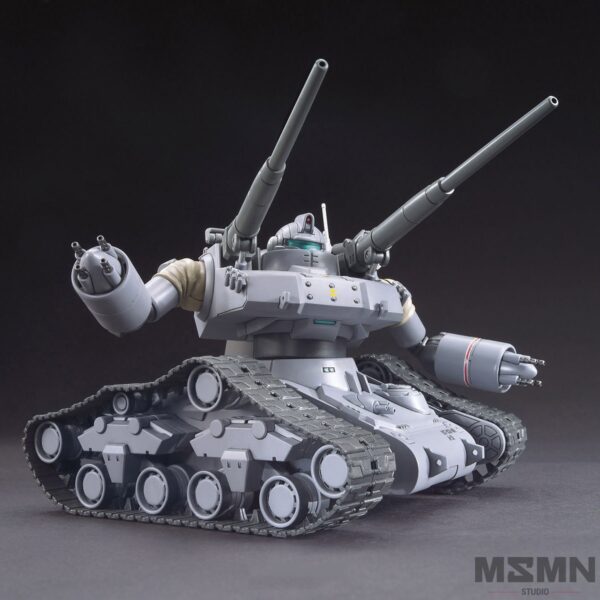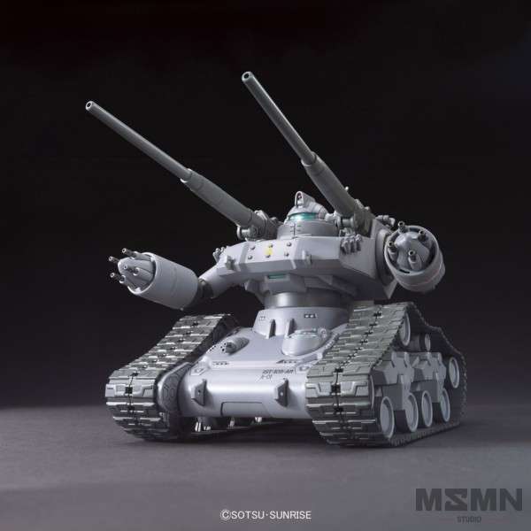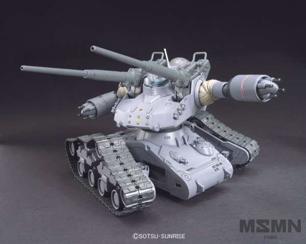 The Guntank from “Gundam The Origin” is more squat and vehicle-like than we’re used to seeing. It has movable arms and waist, elevating cannons (with dampers that move with the angle of the turret), and flexible (although non-working) treads. Includes details such as radiator fins and a tank hatch that can be built in an open position. Molded in gray, dark gray, and khaki, with dry-transfer decals for markings.
