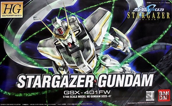 Simple 1/144 scale HG kit of the beautiful Stargazer Gundam comes with its beam shield generator backpack, a Beam Gun KSM71/J, three clear green beam rings and a stainless steel rod to hold the rings in place, plus a display base. Two types of stickers (sparkling gold, and black) are included for you to apply on the kit.