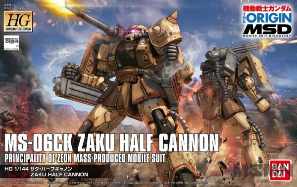 The Zaku Half Cannon from “Mobile Suit Gundam – The Origin MSD” makes its High Grade kit debut! Its characteristic 180mm cannon and gatling gun are included, and you can also hook up the twin big guns to the backpack. It’s also got a Heat Hawk in both deployed and stored form. Foil stickers are provided for the markings.