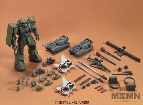 Recreate the heated battle scenes seen in the “Mobile Suit Gundam MS IGLOO 2: Gravity Front” OVA or build your own custom One Year War battlefield diorama with this impressive HGUC set offering! Included are snap-fit parts that come molded in color and allow you to build a HGUC mass production type MS-06 Zaku, which can be equipped with weaponry consisting of a Zaku Machine Gun, Heat Hawk, a pair of three-tube missile pods, Zaku Bazooka with two firing effect parts, two Crackers, and two Sturm Fausts. Three pairs of optional hands are provided. Also packed in this set are two Type-615+ E.F.G.F. M61A5 main battle tanks with two explosion effect parts, two PVN.4/3 Wappas, plus four Zeon and four Earth Federation soldiers (figures come molded in gray). A foil sticker and a sheet of waterslide marking decals are included.