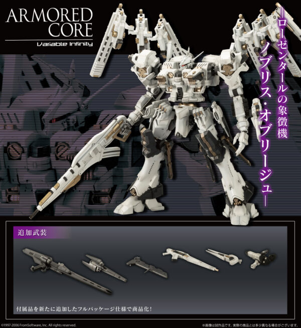 The Noblesse Oblige from the popular “Armored Core” game series is now available as a model kit from Kotobukiya with new accessories! In addition to its typical weapons, the armed parts that come with Orgill and Orgill Gunmetal Version are also included. This mechanical warrior is bristling with weapons, and would look great displayed on your shelf — place your order today!