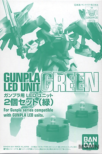 Before now the only way to get the LEDs needed for such kits as the MG Qan[T] and 00 Raiser (both linked below) was to go through the parts department in Bandai Japan. Well, probably due to the enormous demand for these LEDs Bandai has opted to sell them in this great 2 unit set. This set is for the green LED used in the kits linked below. Each unit takes 2 LR41 watch batteries (sold separately).
