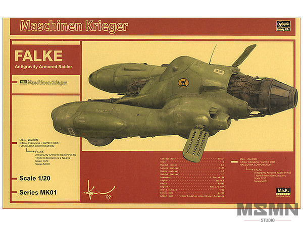 From Kow Yokoyama’s amazing world of “Maschinen Krieger” comes the Pkf. 85 Falke Antigravity Armored Raider, the debut release in what promises to be a very exciting series of Ma.K. kits from Hasegawa! Sharply molded with fantastic detail, the big Falke will measure 28.6cm (almost a foot) long when completed. Includes a nicely detailed cockpit, engine, and gun areas, and comes with two figures, one standing and one seated. Waterslide decals are included for eight versions. Also includes two Falke data cards, and assembly instructions in Japanese with English.