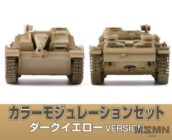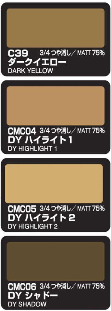 Usage example of CS582 Dark Yellow VER. STEP 1 Spray shadow (CMC06) in deeply recessed parts or around legs, and then paint overall with base color (Dark Yellow (C39)). At this time, if you repaint in such a manner as not to paint over the deep parts sprayed beforehand so that the shadow of those parts can be seen feathering through, it will give a good accent. STEP2 After giving an overall coat using base color, let’s start “Color Modulation” Use Highlight 1 (CMC04) in such a manner as to leave a reasonable amount of base color showing, and when painting try to avoid having panels painted with Highlight next to each other. STEP3 Add high tones using Highlight 2 (CMC05) to increase contrast.The areas painted should be smaller than the areas painted with Highlight 1 earlier on.When sufficient contrast is obtained with Highlight 1, it is possible to use Highlight 2 to paint bolt heads, small hatches or projecting components using a brush as accents. STEP4 Lastly, try to tighten up the overall impression if it becomes blurred with white spots from Highlight painting.Use Shadow (CMC06) to paint recessed areas (deep parts) to Highlight.If Shadow is sprayed on too heavily, the contrast between bright parts and dark parts tends to be extreme,so dilute the paint to make it a little weak, then paint on little by little while observing the results and avoid fixing the color with just one coat.