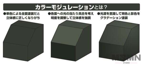 The actual figure will look three dimensional because of the shading as light falls on it, but if nothing is done after painting, the figure can give a sort of flat impression, has little presence and becomes dreary. The technique used to emphasize the stereoscopic effect by changing the tone of even just one color is called “Color Modulation”. In some cases where you have a small piece such as a model, it is not easy to see the change just by changing the color of each surface. So gradation painting is used to emphasize the stereoscopic effect.