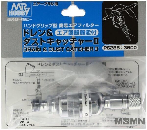 To keep water and dust out of your paint, attach this air filter and regulator between your air source and your airbrush. Attaches with a standard S connection on both ends (female to the airbrush, male to your compressor hose).