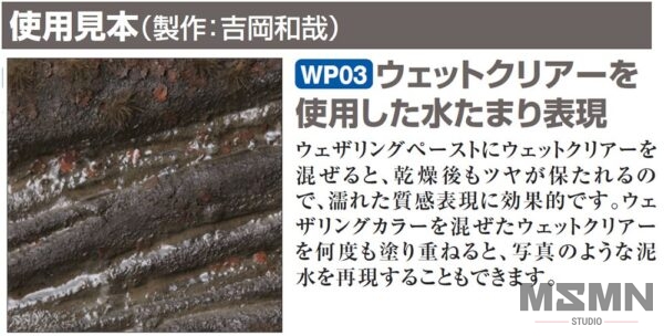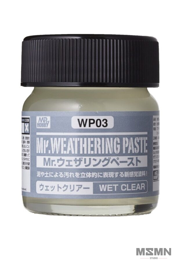 MR.WEATHERING PASTE is very thick, so it is most suitable for reproducing three dimensional stains such as mud. WP03 WET CLEAR can reproduce a moistened texture when it is mixed with other WEATHERING PASTE.When used on its own, you can create a puddle effect.