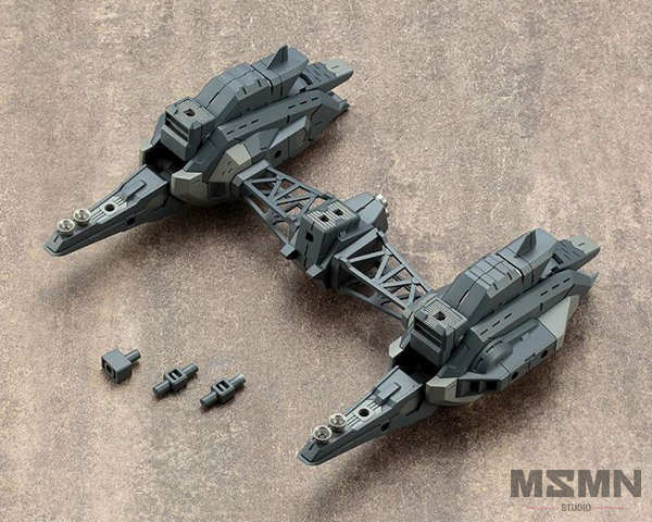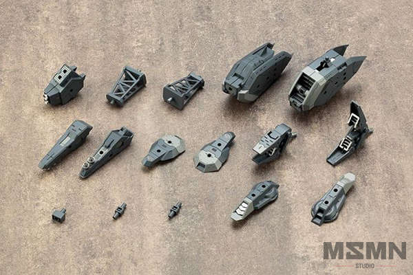 This super-large booster unit is just what your Frame Arms kits need for extra power! Each unit can be attached with a 3mm diameter connection, and can also be used as a built-in type of leg unit (exchange it with the Frame Arm’s knees; the vectorized nozzle will expand to form an ankle unit).