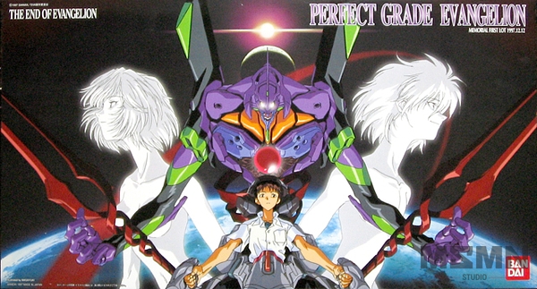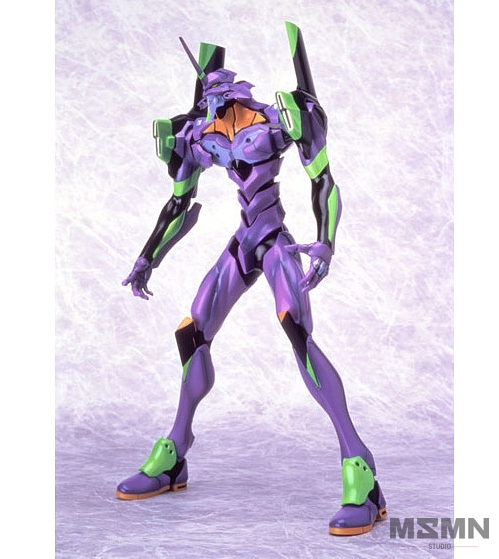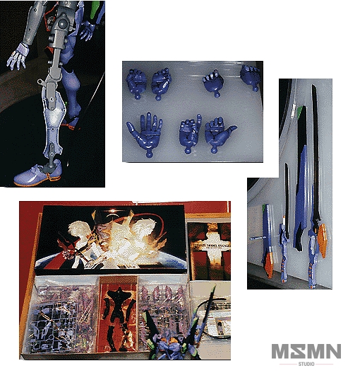 Without question, this is the ultimate EVA kit. The completed item stands 34.5cm high, bigger than nearly every other EVA kit that has been released. The basic structure is completely different from the existing LM-HG kits. An inner, posable skeleton of heavy-duty, semi-hard plastic is covered by soft, black, rubber covers that conceal the inner frame at the “gaps” in the EVA’s armor at joints, on the abdomen and other places. This rubber suit is then covered in turn by the usual outer plastic panels. This structure, the designers say, give it a durability and poseability well beyond what you are used to seeing in Bandai HG and MG kits. Also, in addition to doing all the things that the LM-HG kits do, this kit’s shoulder panels open (both sides) for weapon storage, and a plug-in power pack (takes 2 AAA batteries) lights up the EVA logos on its shoulders. Five sets of hands are included, as are the Pallet Gun, Progressive Knife, Two swords (long & short) with scabbards, the inner Eva head and a red metallic-plated “core.”