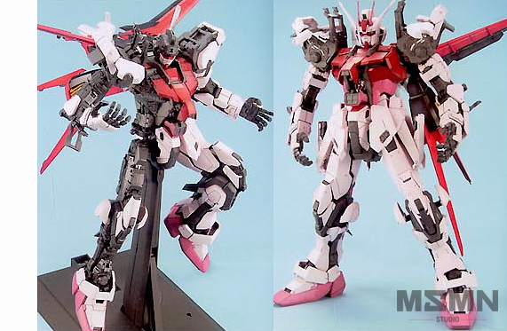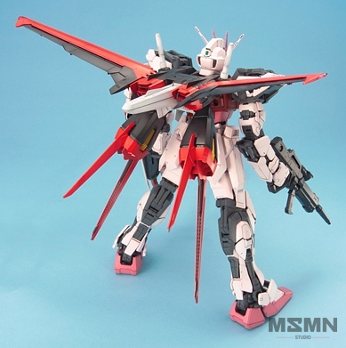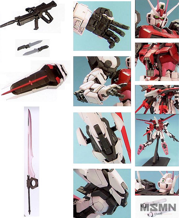 Gorgeous! Bandai’s Perfect Grade line continues with Gundam Seed’s “Strike Rouge,” superbly molded in coloured plastic, with the same fantastic construction quality demonstrated in previous PG kits. A whopping number of parts are included in the typically-large (and heavy!) box — besides the Strike Rouge, there are parts included for the Skygrasper and Aile Striker! Metal-plated parts (in pink!) are included for the Strike Rouge’s custom weapons. Screws, springs, fabulous Gundam Stickers and dry-transfer decals are included; two construction manuals (one for the Strike Rouge, one for the Skygrasper and Aile Striker) are included to walk you through the building of all three models. An “instruction manual” is also included for those who like to paint their Gundam models (of course it doesn’t need to be painted), and also for indicating precise locations of the markings.