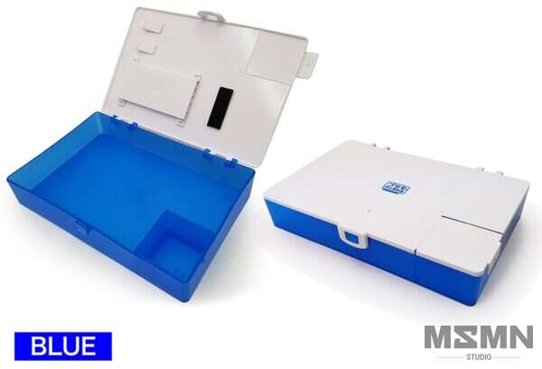 This plastic tool case, in black with a white lid, snaps securely shut, and features room for your nippers, cutter knives, and so forth. Very helpful to keep your gear clean and organized! Measures 20.2cm by 13.4cm by 4.2cm.